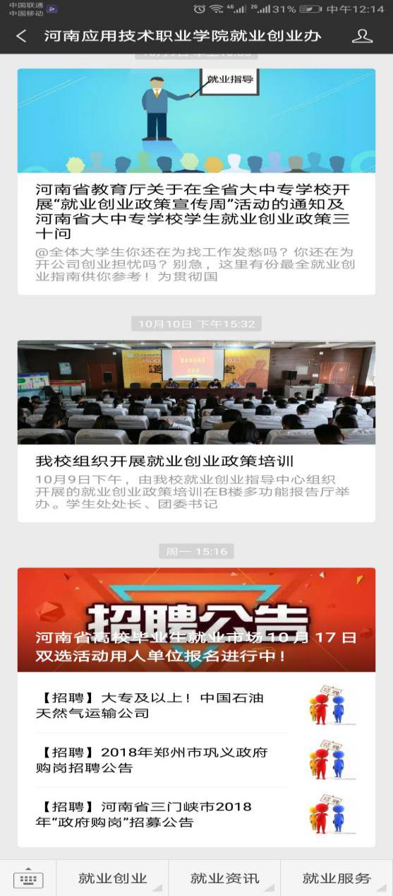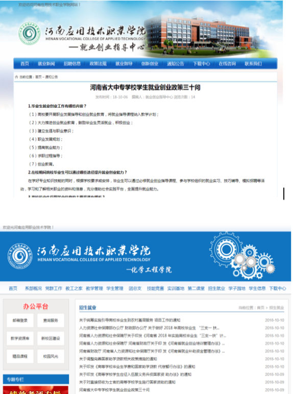 同时,学校就业创业指导中心整理汇总近年国家、省、学校各级就业创业相关政策文件,充分利用互联网、新媒体在学校就业网站、各二级学院网站、微信公众平台、学院教师qq群及各班级的微信群、QQ群中集中发布,让广大师生能够及时查询相关政策并载有关文件,随时随地获取相关就业创业政策。