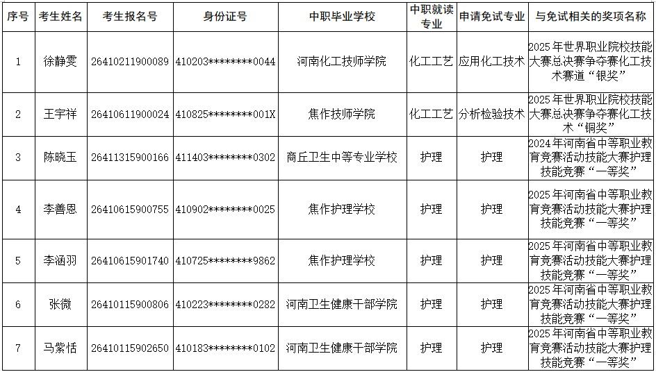 根据《河南省教育厅关于做好2026年高等职业教育单独考试招生和技能拔尖人才免试入学工作的通知》(教学〔2026〕34号)文件精神和要求,经考生本人提出申请,我校对考生提交的免试资格材料进行确认,并报省教育厅职成教处核准备案,现对符合免试入学资格的考生名单公示如下: