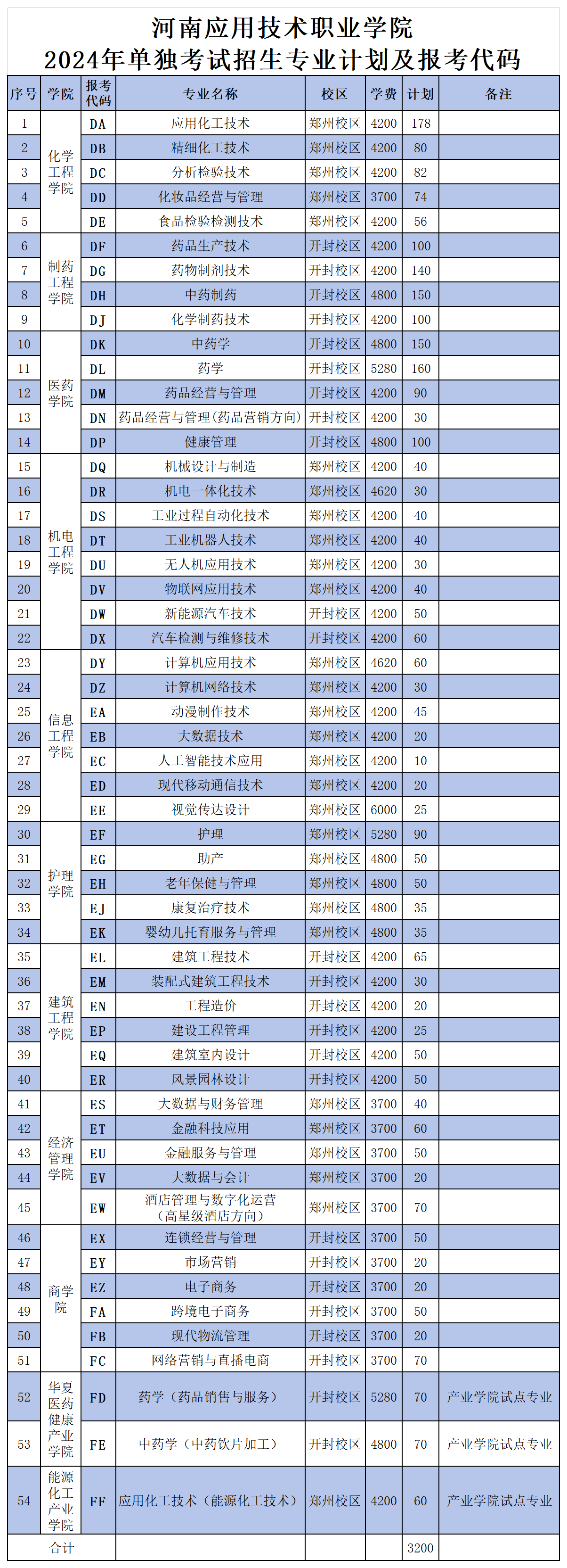 2024年学校单独考试招生专业分普通专业和产业学院试点专业两类,普通专业51个,产业学院试点专业3个,招生总计划3200人。3个产业学院试点专业情况如下:应用化工技术(能源化工技术方向)专业隶属于我校能源化工产业学院;药学(药品销售与服务方向)、中药学(中药饮片加工方向)2个专业隶属于我校华夏医药健康产业学院。产业学院试点专业采取校企联合培养模式,第二学年进入产业学院合作企业培养。