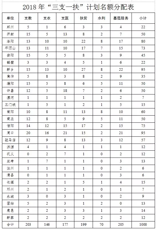 省“三支一扶”工作协调管理办公室(以下简称“三支一扶”办)于2018年6月1日在河南省人力资源和社会保障厅官网“三支一扶”专栏、河南省毕业生就业信息网发布招募公告及招募岗位计划。