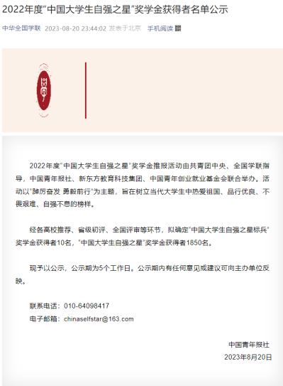 此次推报活动以“踔厉奋发 勇毅前行”为主题,旨在树立当代大学生中热爱祖国、品行优良、不畏艰难、自强不息的榜样,活动经各高校推荐、省级初评、全国评审等环节,拟确定“中国大学生自强之星标兵”奖学金获得者10名,“中国大学生自强之星”奖学金获得者1850名。