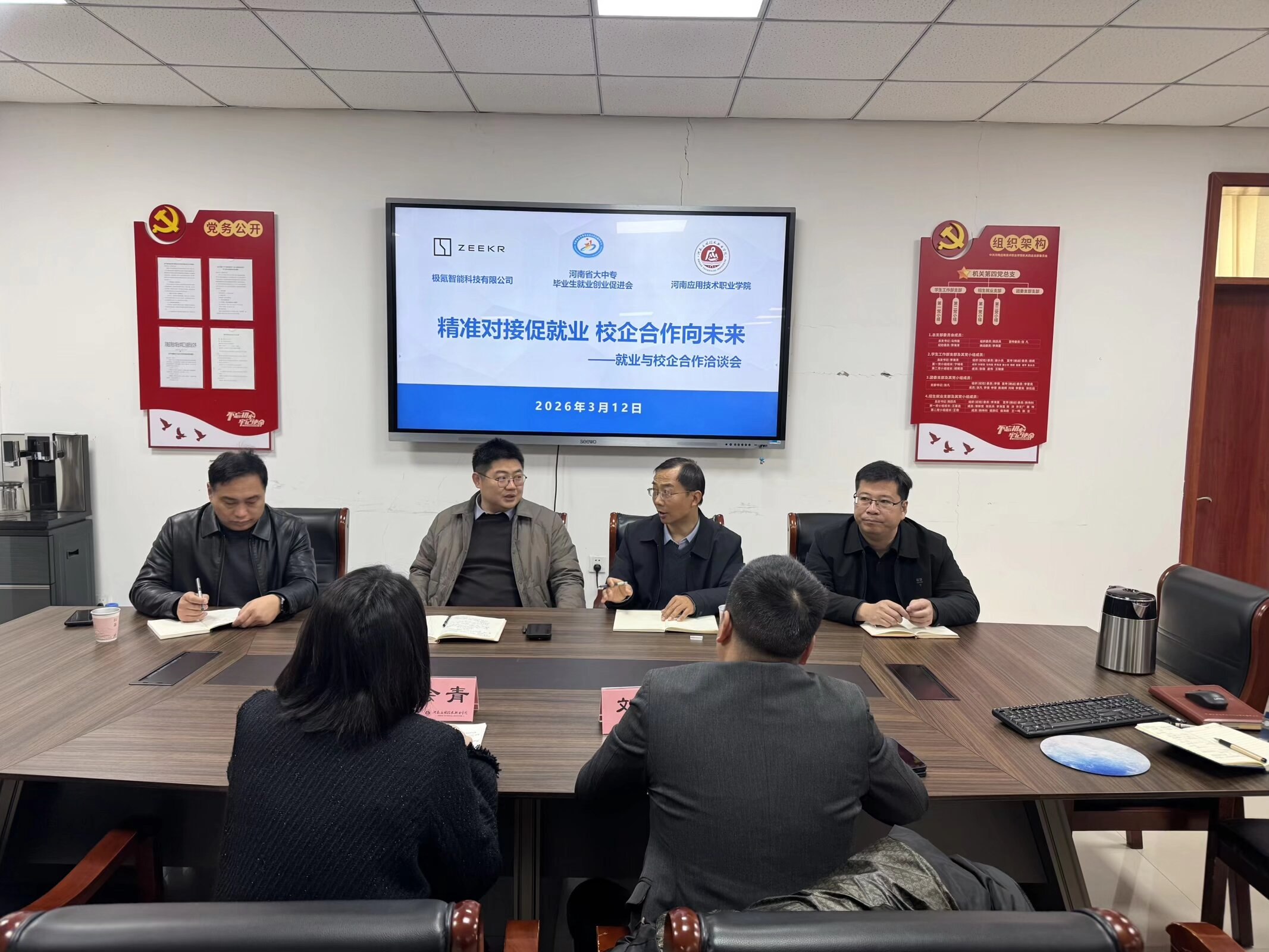 为深入贯彻“访企拓岗”促就业专项行动,深化产教融合与校友资源共享机制,3月12日,河南省大中专毕业生就业创业促进会外联部部长叶会青与极氪智能科技校企事业部总监刘涛一行到访我校,开展就业与校企合作洽谈会。会议就我校助力“河南省校友企业家联盟”建设、充实联盟专家库等事宜进行深入交流。学校招生就业与校企合作处处长张二月主持会议,新能源与智能汽车学院相关领导参加座谈。