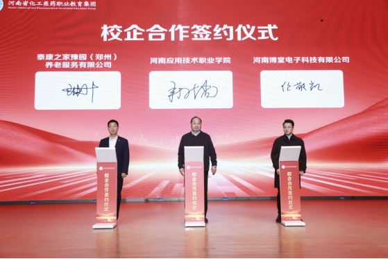 会议上,集团与广东联兴建设有限公司、华兰生物工程股份有限公司、泰康之家豫园养老服务有限公司、河南博堂电子科技有限公司隆重举行了签约仪式。此次合作,不仅体现了集团与各企业之间在人才培养、科技创新、社会服务等方面的深度对接,也彰显了校企双方携手共进、共谋发展的坚定决心。