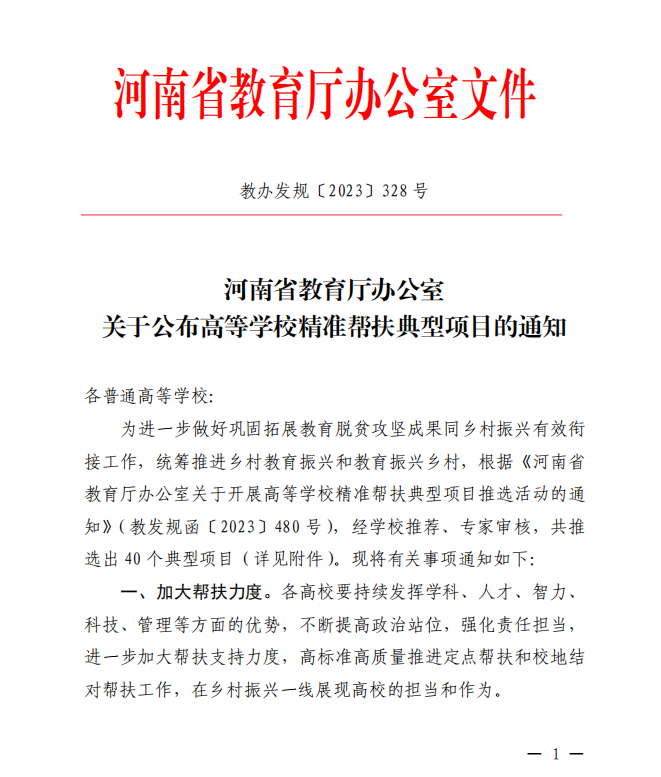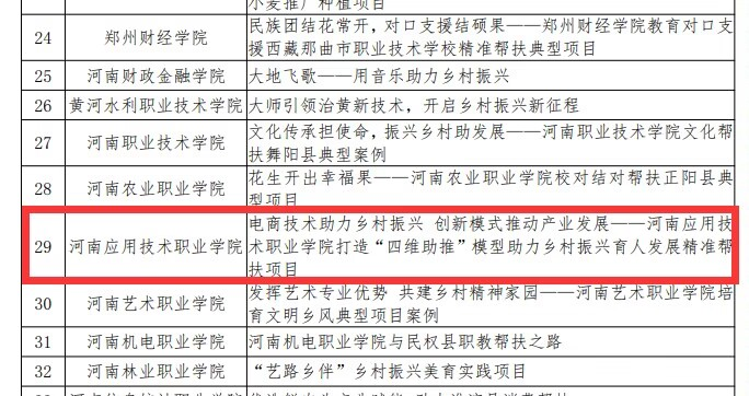 近日,河南省教育厅公布了河南省高等学校精准帮扶典型项目的入选名单,河南应用技术职业学院的《电商技术助力乡村振兴、创新模式推动产业发展——河南应用技术职业学院打造“四维助推”模型助力乡村振兴育人发展精准帮扶项目》脱颖而出成功入选。