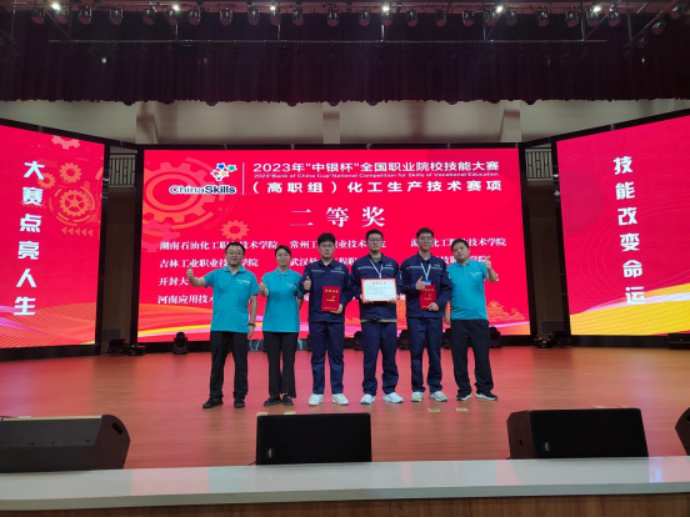 8月22日,2023年全国职业院校技能大赛(高职组)“化工生产技术”赛项在甘肃省兰州石化职业技术大学落下帷幕,由河南应用技术职业学院化学工程学院学生关路鹤、张腾宇、方振宇组成的参赛队,从54支队伍中脱颖而出,荣获国赛二等奖。