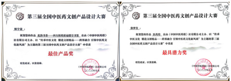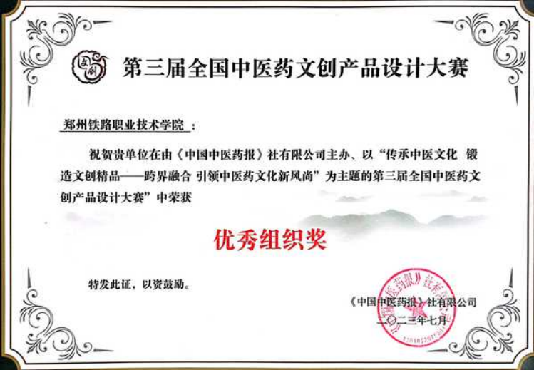 7月21日,由《中国中医药报》社主办的第三届全国中医药文创产品设计大赛颁奖仪式在南宁顺利举行,郑州铁路职业技术学院师宇豪同学设计的《花韵书香》获最佳产品奖,徐梦佳同学设计的《医药绘》获最具潜力奖,学校荣获优秀组织奖,王晶晶同志获优秀指导老师奖。