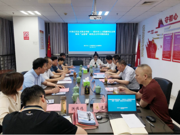 为进一步深化学校与地方政府在人才智力方面的合作,搭建校政企职业教育发展共享平台,7月2日,河南应用技术职业学院校长薄新党带队赴浙江绍兴市参加校政企合作对接洽谈会。绍兴市职业技能开发指导中心主任吕军良、副主任陈志刚,绍兴地区行业高端企业有关负责人及学校相关部门负责人参加会议。会议在绍兴市人力资源和社会保障局五楼会议室举行。
