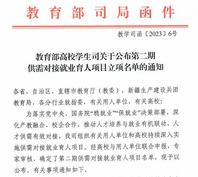 近日,教育部高校学生司发布《关于公布第二期供需对接就业育人项目立项名单的通知》(教学司函〔2023〕6号),经高校申请、用人单位申报、专家审核、立项单位信息核查等流程,河南应用技术职业学院经济管理学院申报的就业实习基地项目及信息工程学院申报的人力资源提升项目获批立项。