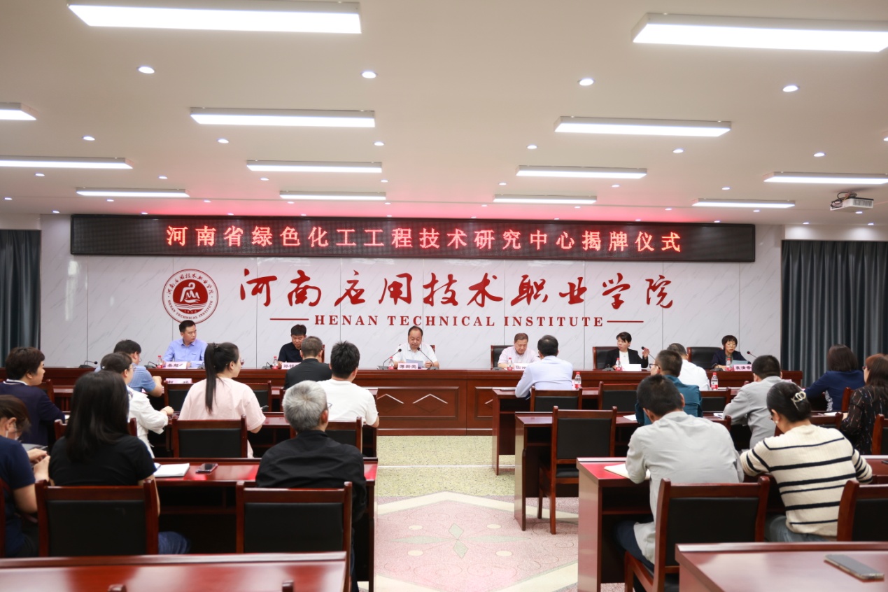 6月2日下午,由河南应用技术职业学院与河南莱帕克化工设备制造有限公司、河南省科学院应用物理研究所有限公司、郑州炜盛电子科技有限公司联合共建的“河南省绿色化工工程技术研究中心”揭牌仪式在学校1号实训楼六楼会议室隆重举行。学校校长薄新党、郑州大学教授任保增、河南莱帕克化工设备有限公司董事长孙铭洲、河南省科学院应用物理研究所有限公司副研究员吴顺丽、郑州炜盛电子科技有限公司人力资源部经理桑超杰及学校相关部门负责人、省绿色化工工程技术研究中心团队全体成员出席揭牌仪式,会议由学校科研外事处处长袁清香主持。