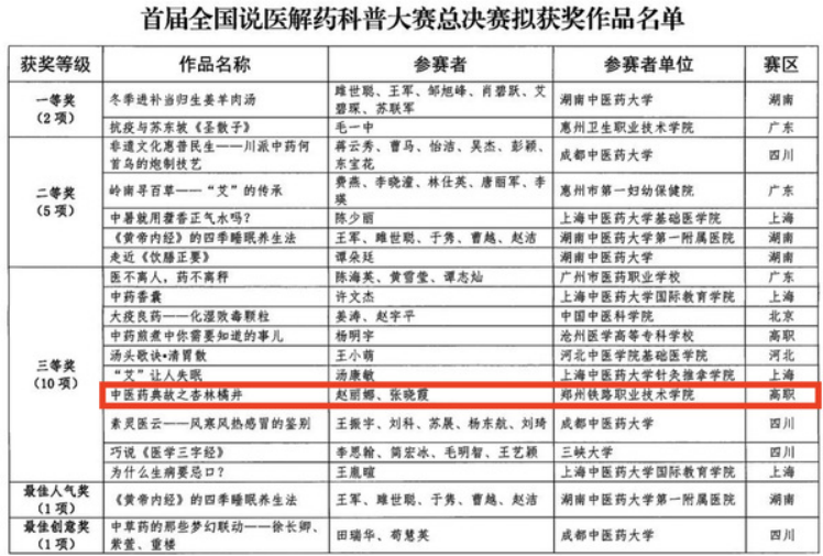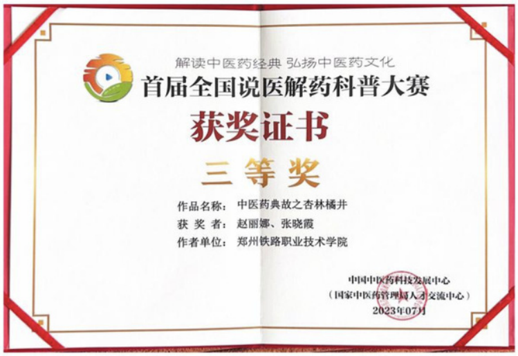 近日,由国家中医药管理局指导、中国中医药科技发展中心主办的首届全国“说医解药”科普大赛总决赛颁奖暨第二届大赛启动仪式在京举行。郑州铁路职业技术学院参赛作品“中医药典故之杏林橘井” 经过作品初评、“央视频”网络展播投票和专家终评等多个环节的层层评选,从全国2600余件参赛科普作品中脱颖而出,荣获全国赛三等奖。